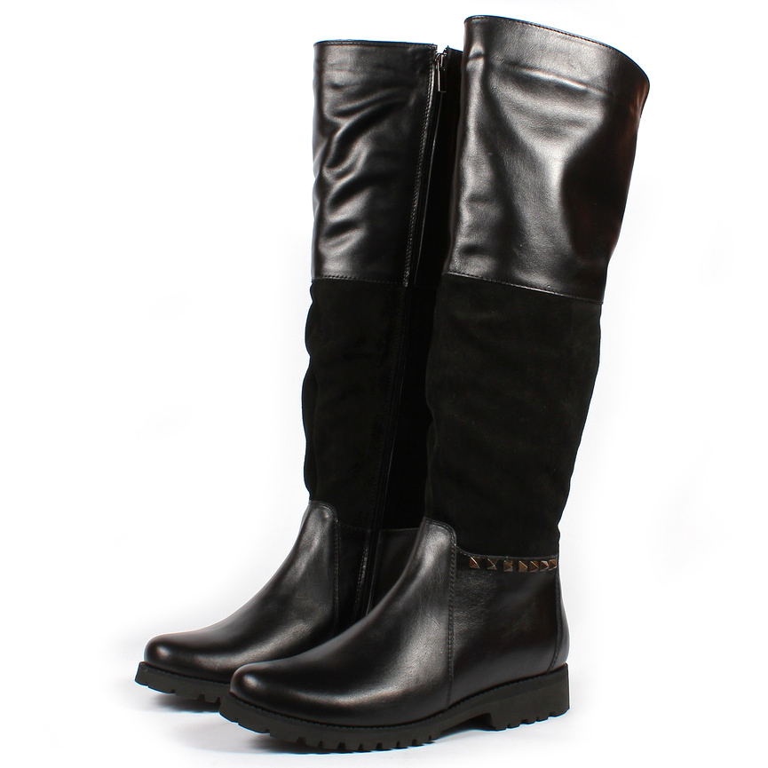 Зимние сапоги большого размера на низком каблуке. Модель выполнена из натуральной кожи и имеет лёгкую сборку голенища в центральной части. Нет характерной классическим сапогам «приталенности» в зоне щиколотки. Подкладка — байка + натуральная шерсть в нижней части. Молния с внутренней стороны до конца. Легки и неприхотливы в уходе.